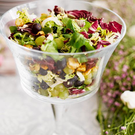 - Kaada paistettu lehtikaali vadille. Ripottele päälle ohrahelmet, kurpitsakuutiot, kuivatut karpalot ja kurpitsansiemenet.