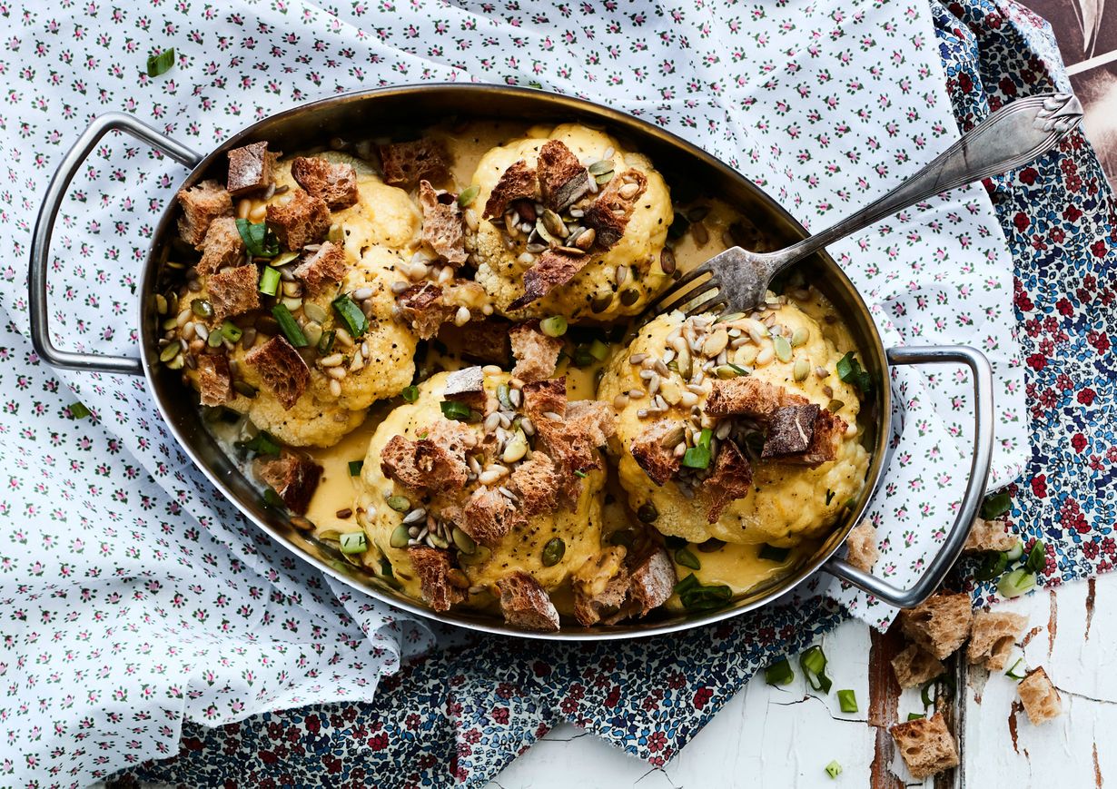 - Yhdistä sulatejuusto, keltuainen, sinappi ja sitruunankuoriraaste. Levitä seos kukkakaalien päälle. Ripottele pinnalle leivänmuruja, siemeniä ja mustapippuria. Jatka paahtamista uunin keskitasolla 7–10 minuuttia, kunnes kuorrutus saa kauniin värin.