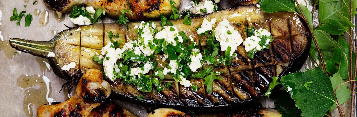 - Grillaa munakoisot kauniin ruskeiksi ja aivan pehmeiksi, molemmin puolin noin 5 minuuttia. Levitä fetaseos kypsille munakoisoille.