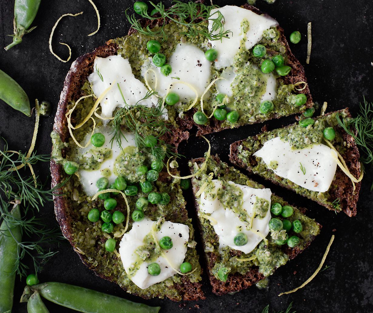 - Halkaise reikäleipä. Sivele puolikkaat tilli-hernepestolla. Säästä halutessasi vähän pestoa viimeistelyyn. Revi päälle mozzarellajuusto. Ripottele herneet juustopalojen lomaan.