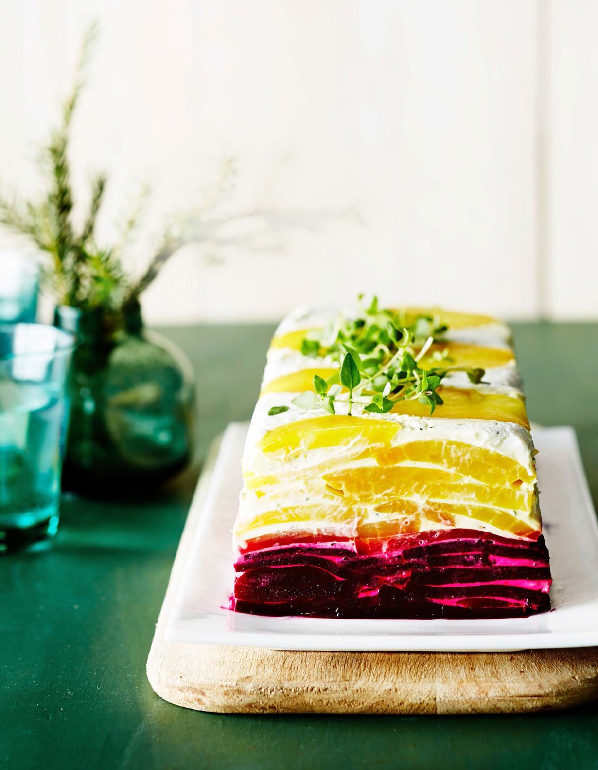 - Lado vuoan pohjalle keltajuuriviipaleita. Sipaise päälle ohut kerros juustotahnaa ja tee samanlaisia kerroksia, kunnes olet käyttänyt kaikki keltajuuret. Tee sitten samanlaisia kerroksia punajuuriviipaleista. Kun terriini on valmis, peitä vuoan pinta kelmulla. Nosta painoksi esimerkiksi toinen leipävuoka ja siirrä terriini jääkaappiin tekeytymään.