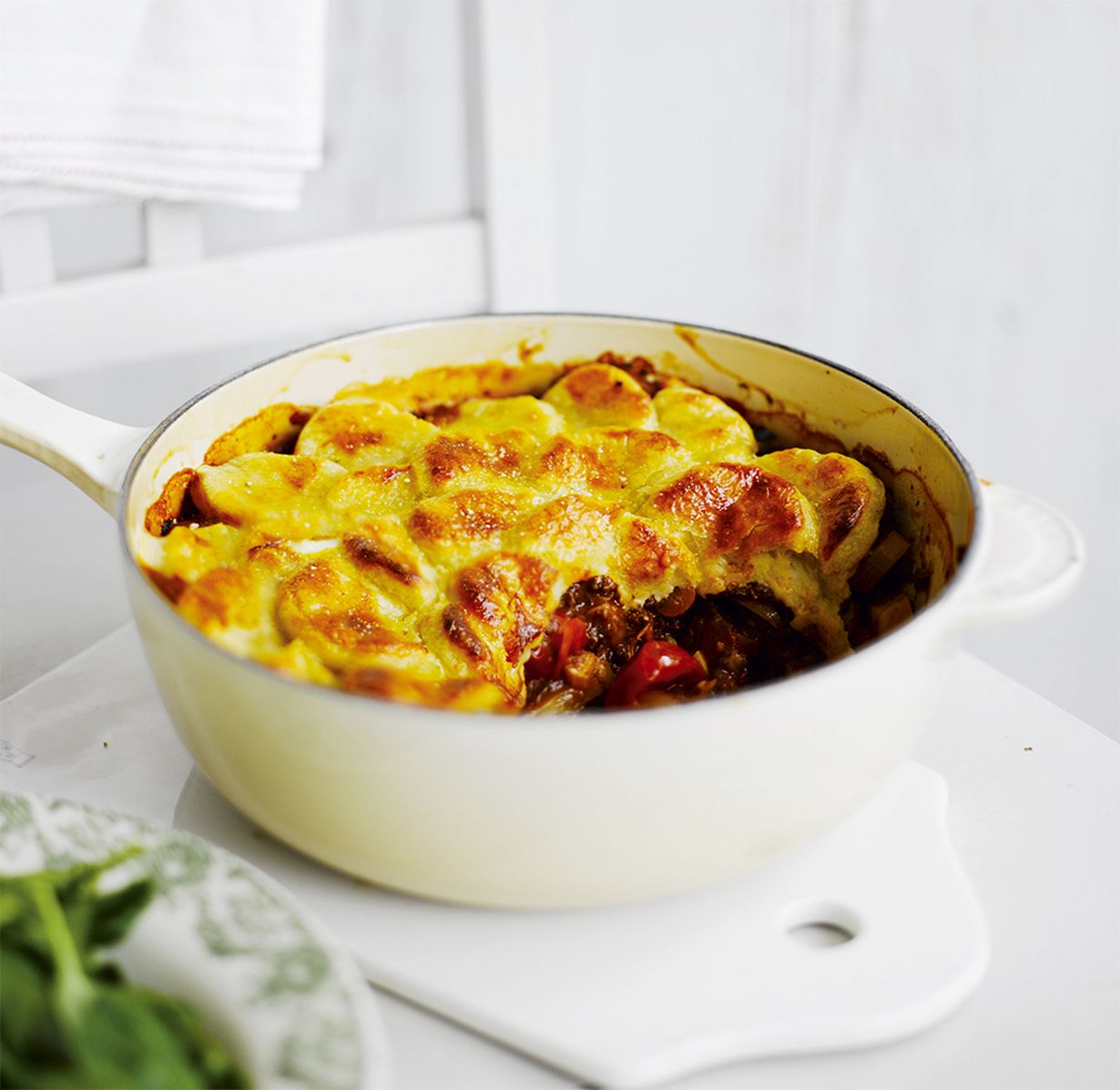 - Nosta kastike patavuokaan. Kauli sulanut taikina ohuemmaksi levyksi ja leikkaa se vuokaa hieman suuremmaksi palaksi. Nosta taikina vuoan päälle. Ylijääneestä taikinasta voi halutessaan taiteilla kuvioita vuoan pintaan. Voitele pinta munalla tai vedellä.