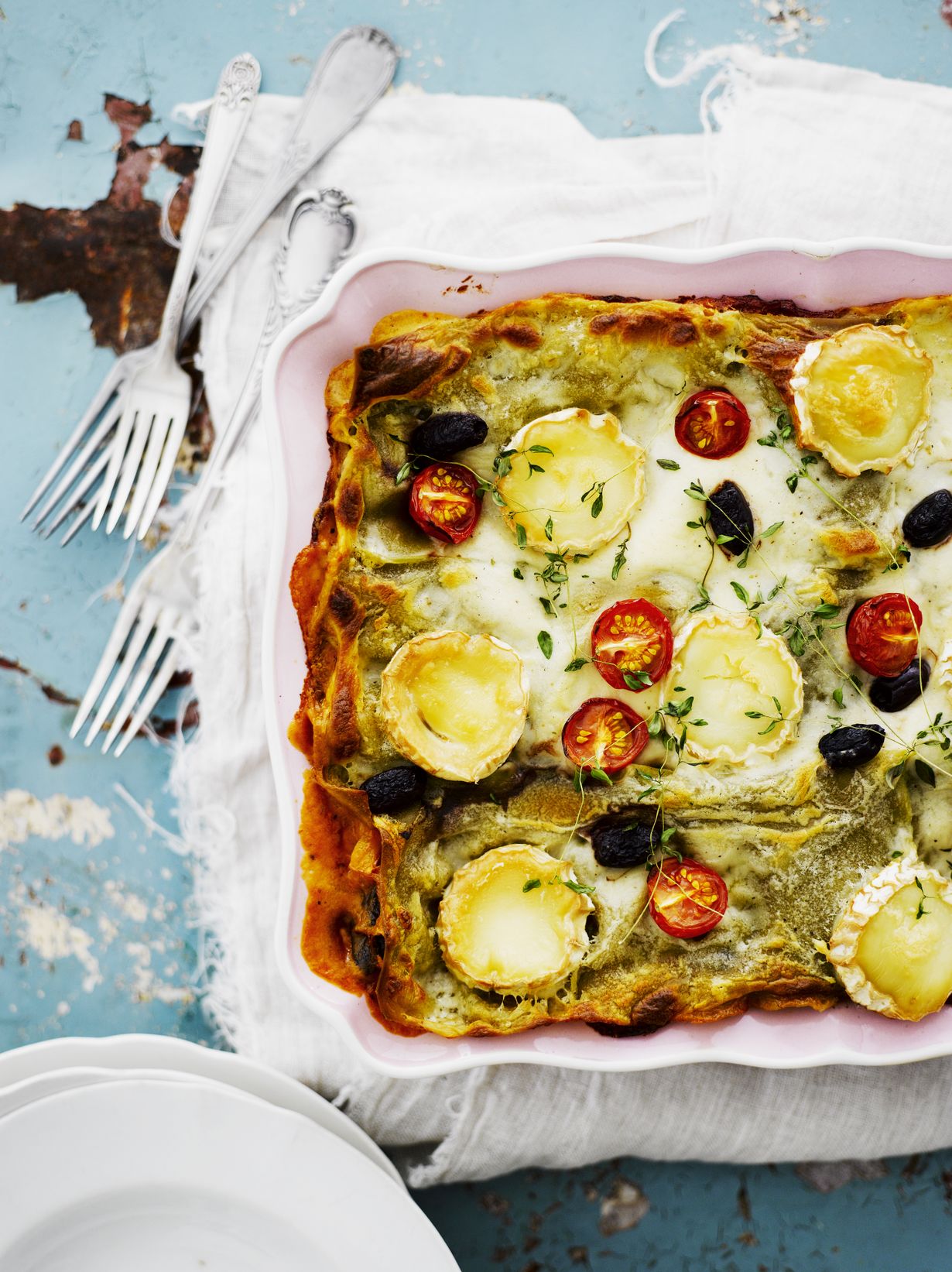 - Jätä lasagnelevyt päällimmäiseksi, levitä niiden päälle juustokastiketta ja ripottele pinnalle juustoraastetta. Leikkaa vuohenjuusto ohuiksi viipaleiksi ja levitä viipaleet lasagnen päälle oliivien ja halkaistujen kirsikkatomaattien kanssa.