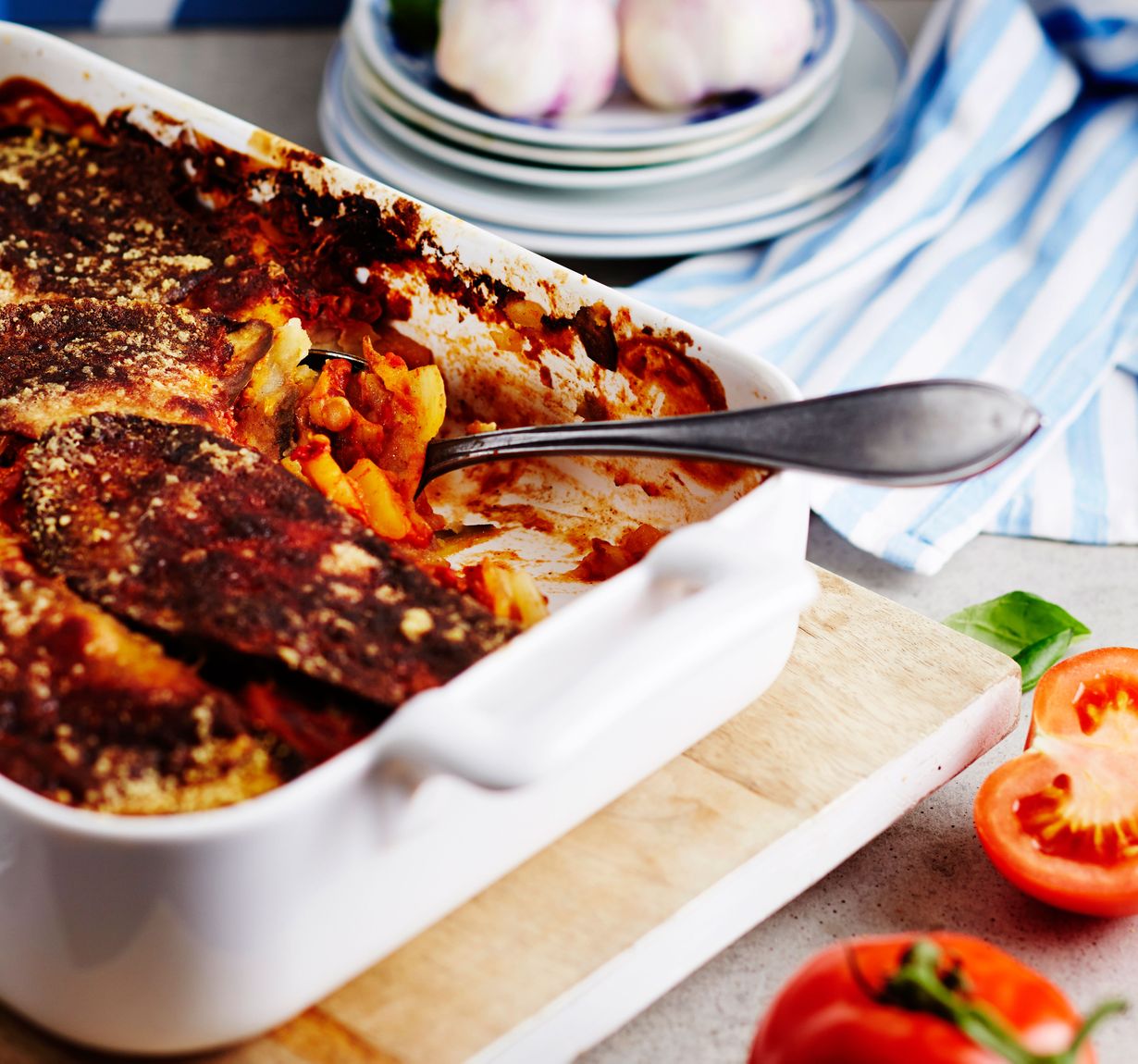 - Lado munakoisoviipaleita voidellun uunivuoan pohjalle. Lisää kerros perunaviipaleita ja tomaatti-linssikastiketta. Toista niin, että päällimmäisenä ovat munakoisoviipaleet. Kaada joukkoon kerma ja ripottele pintaan reilusti juustoraastetta.