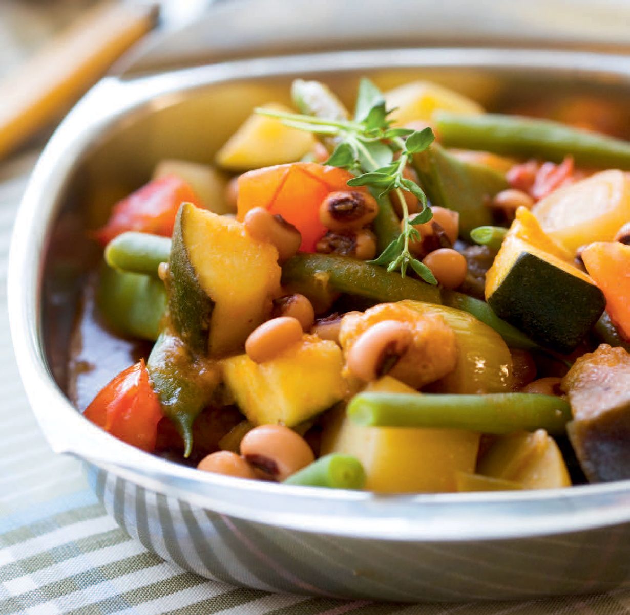 - Keitä sillä aikaa toisessa kattilassa paloitellut tuoreet pavut kypsiksi (noin 10 minuuttia). Sekoita padan joukkoon lohkotut tomaatit ja valutetut pavut, kuumenna ja hauduta vielä noin 5 minuuttia. Tarjoa esimerkiksi rapeakuorisen leivän kanssa.