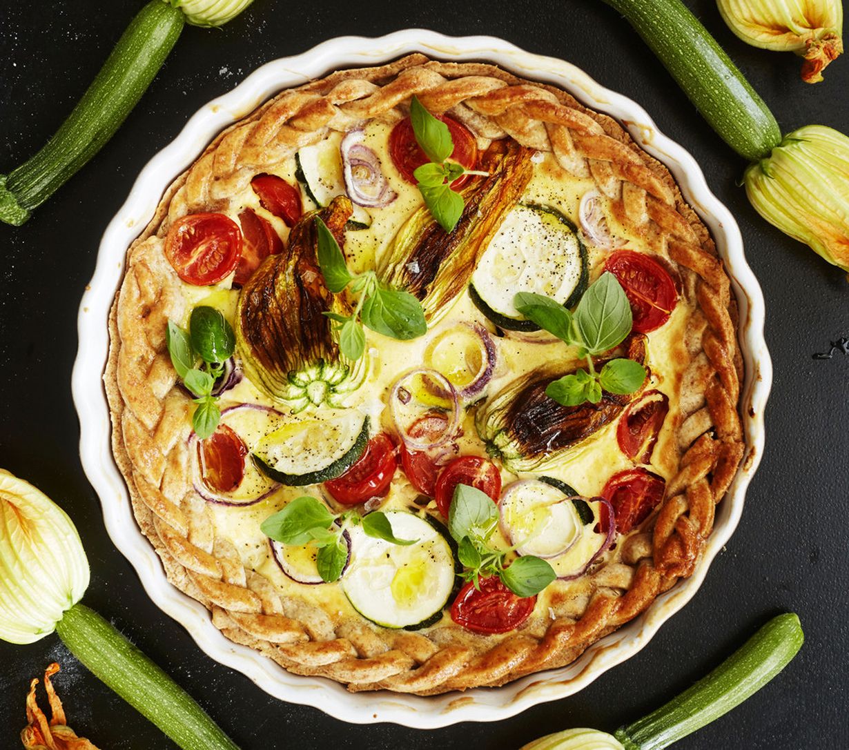 Kasvispiiraan kauneuden salaisuuksia ovat lettireunus sekä värikkäät täytteet, joita ei piiloteta ranskankerman alle.