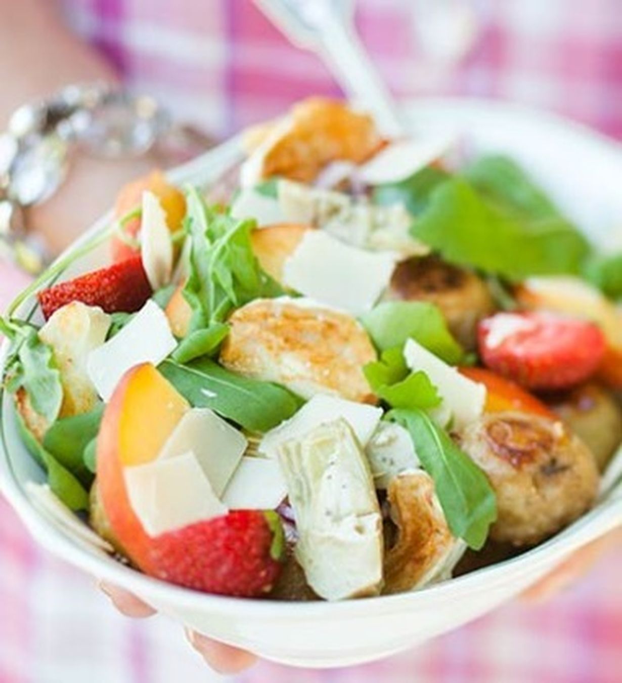 3. Halkaise persikat ja poista kivet. Leikkaa hedelmät lohkoiksi ja grillaa nopeasti kauniin ruskeiksi. Silppua sipuli. Valuta ja halkaise aurinkokuivatut tomaatit, artisokansydämet ja mansikat.