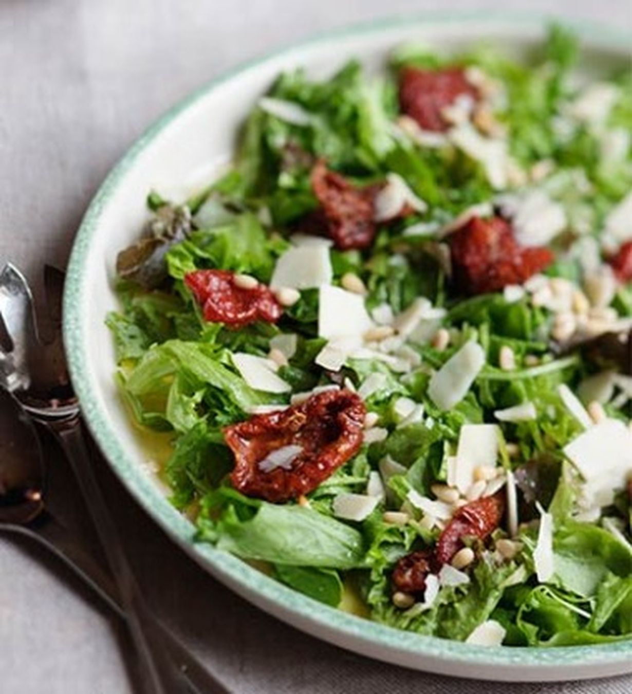 - Revi salaatti ja rucola tarjoiluvadille. Halkaise aurinkokuivatut tomaatit ja asettele salaatin päälle. Vuole salaatille vielä parmesaanilastuja.