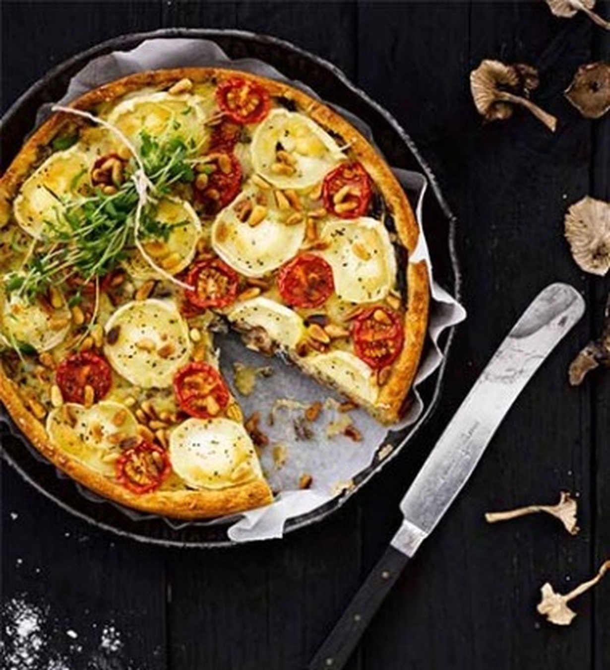 - Koristele piirakan pinta ohuilla vuohenjuustoviipaleilla ja puolikkailla kirsikkatomaateilla.