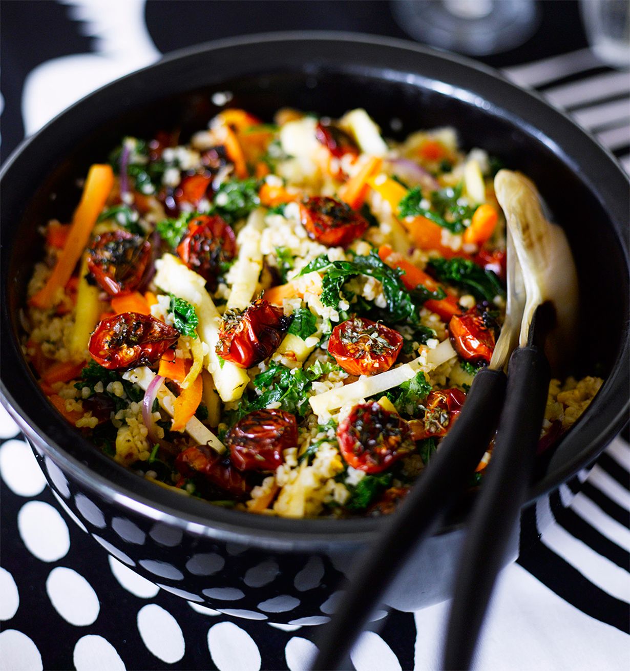 Bulgurisalaatissa on rapsakkaa lehtikaalia.