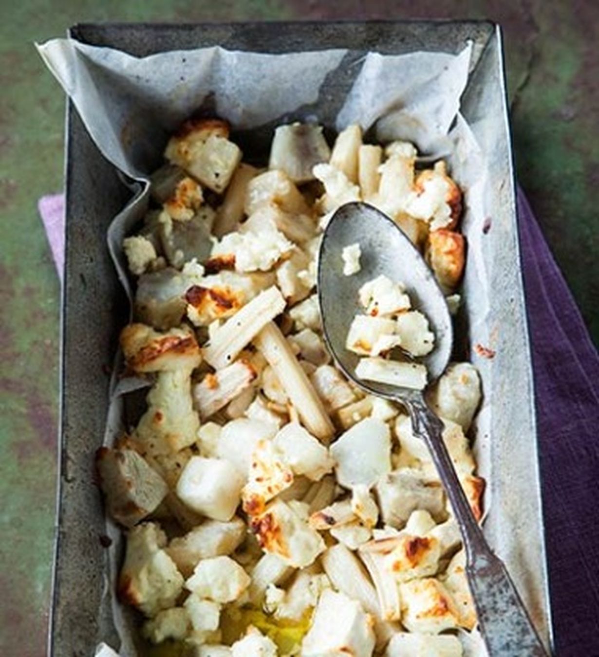 - Kumoa seos uunivuokaan. Paista noin 45 minuuttia. Murustele juusto reiluiksi paloiksi ja sekoita kasvisten joukkoon. Jatka paistamista noin 10 minuuttia tai kunnes juurekset ovat kypsiä.