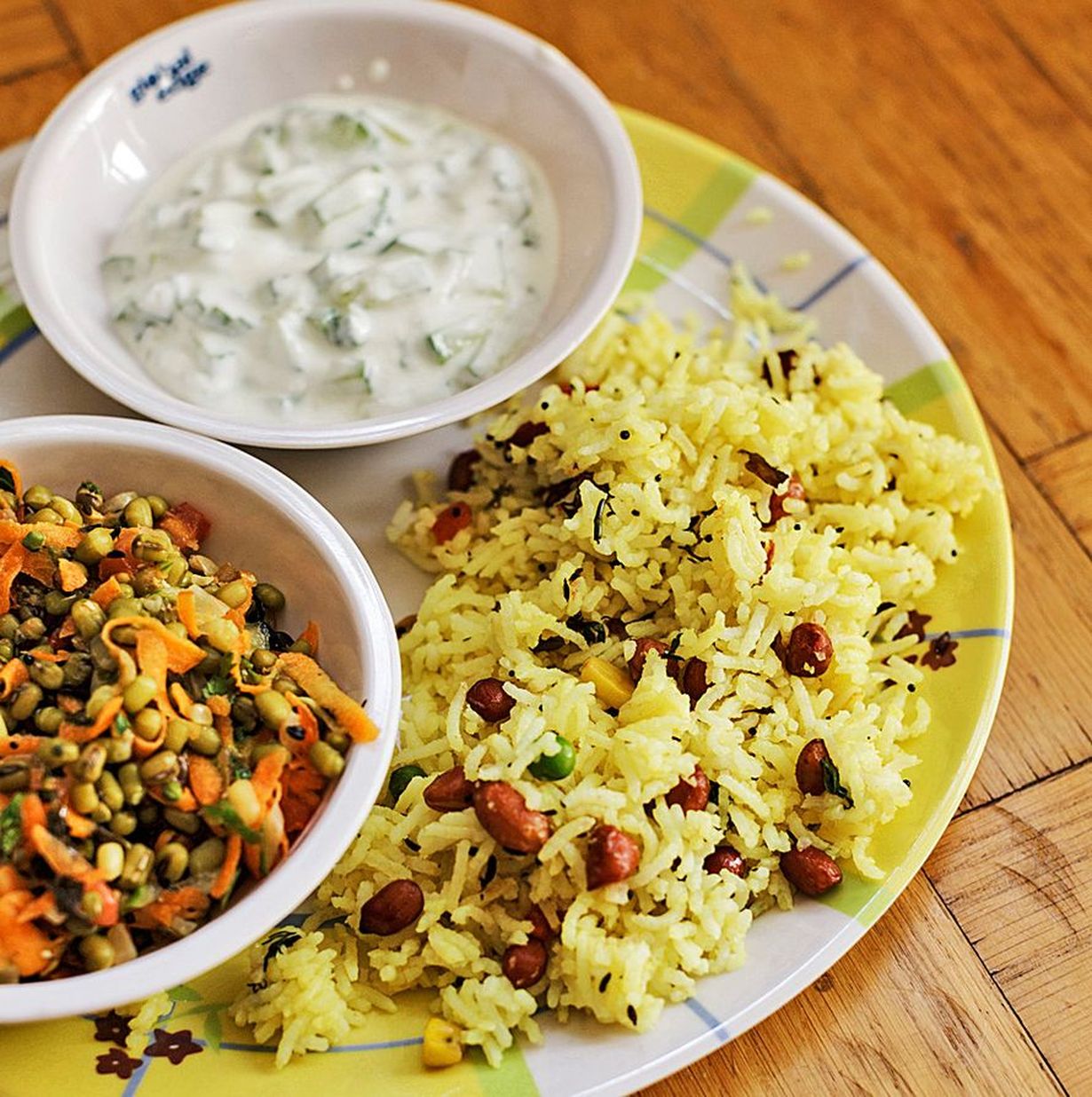 Intialainen lämmin mungpapusalaatti maustetun riisin ja jogurttikastikkeen kanssa