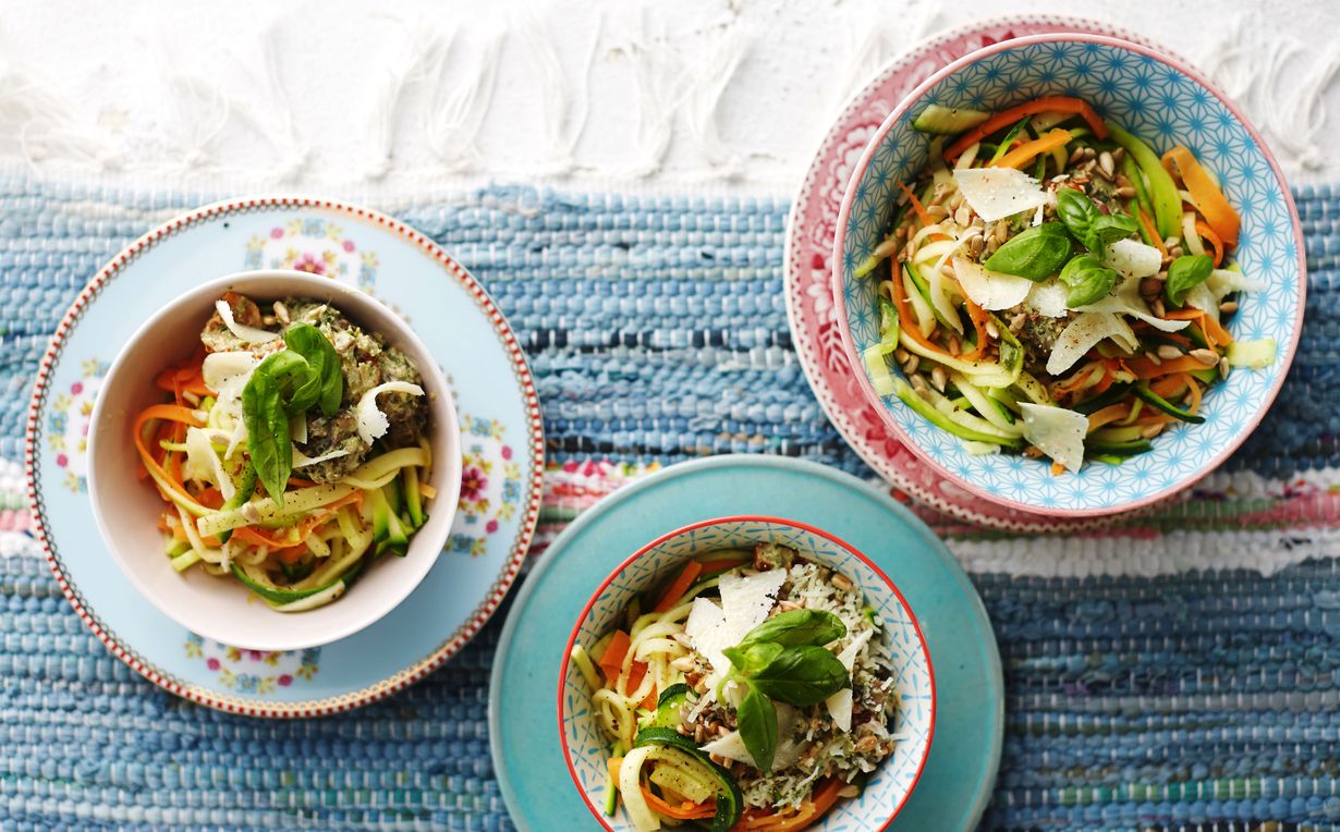 - Huuhdo kesäkurpitsa ja leikkaa siitä juustohöylällä leveitä lastuja. Jätä aivan pehmein, siemeninen sisäosa käyttämättä. Asettele lastut päällekkäin ja leikkaa veitsellä ohuiksi nauhoiksi. Kuori porkkanat ja höylää kuorimaveitsellä lastuiksi. Pinoa ja leikkaa ohuiksi nauhoiksi.
