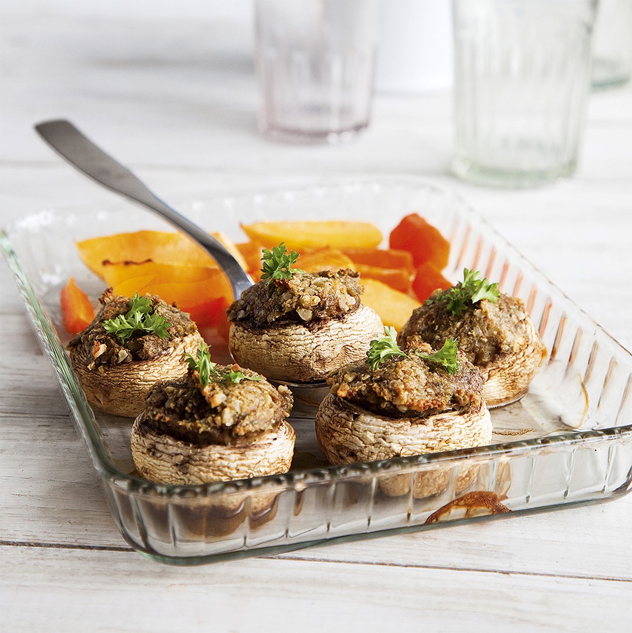 Kypsennä 200-asteisessa uunissa noin 15 minuuttia, kunnes sienet alkavat pehmetä. Ripottele pinnalle persiljasilppua ja nosta tarjolle.