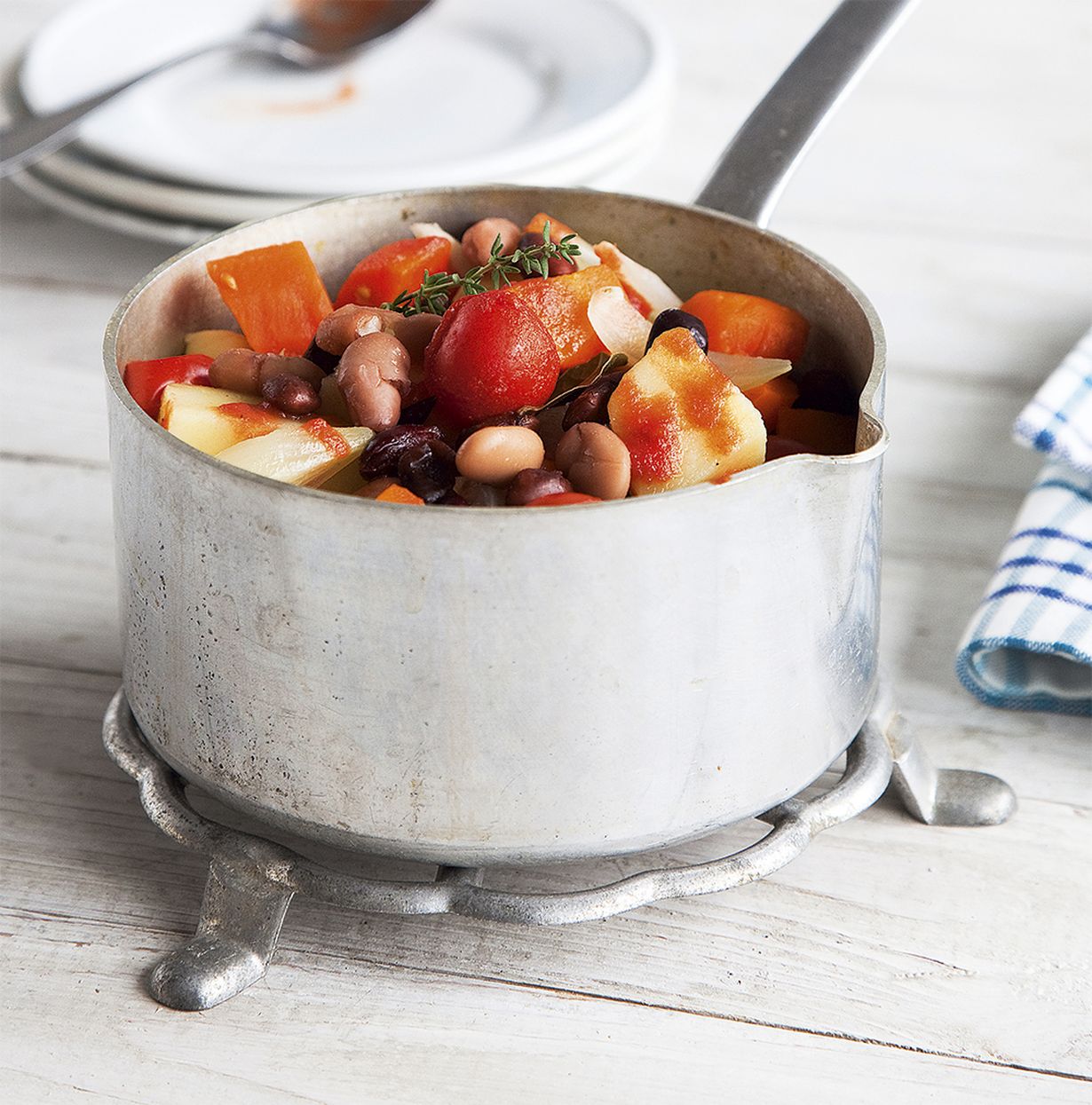 Vinkki! Jos haluat säilyttää kirsikkatomaatit kokonaisina, kaada pataan vai tomaattien liemi ja lisää tomaatit vasta papujen kanssa padan sekaan.
