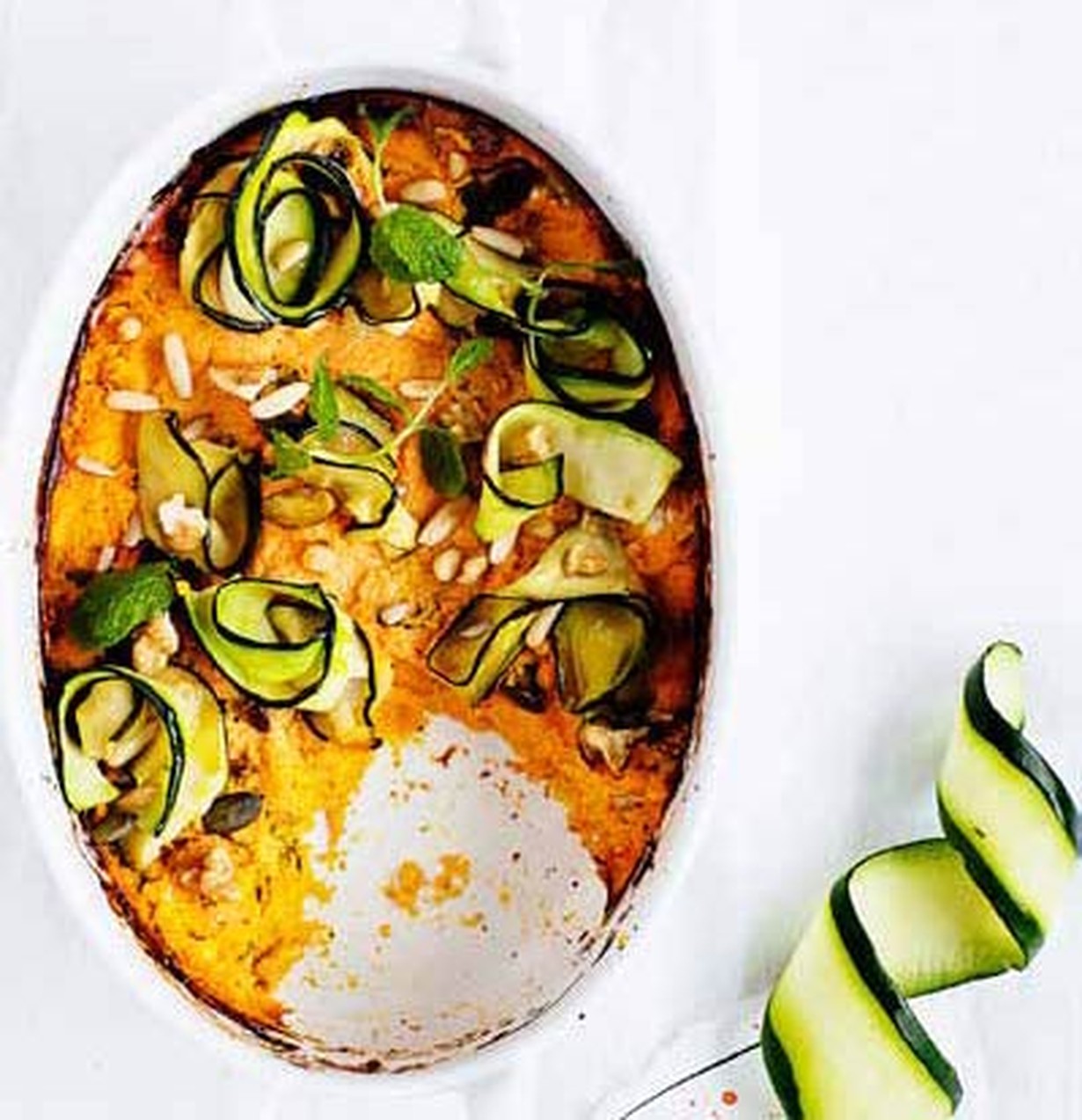 Pähkinöiden rapeus ja valmiin porkkanasoseen pehmeys yhdistyvät sopuisasti helppotekoisessa kasvisvuoassa.