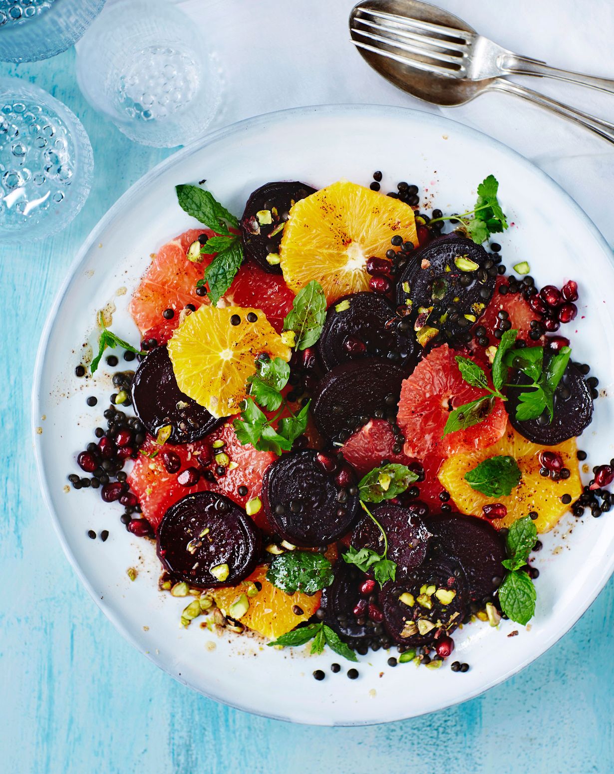 - Kokoa salaatti vadille: pohjalle sitrusviipaleita ja punajuurta, päälle granaattiomenan siemeniä, pistaaseja ja linssejä. Koristele yrteillä ja kaada pinnalle kastike.