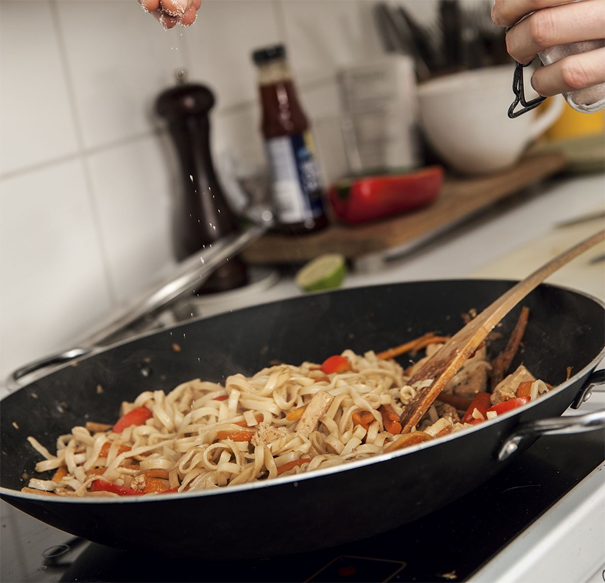 Lisää nuudelit pannulle ja kääntele, kunnes nuudelit lämpiävät. Tarjoa soija- ja sweet chili -kastikkeen kanssa.