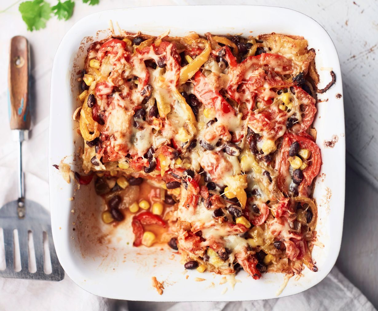 - Voitele uunivuoka voilla. Leikkaa maissitortillat 3 cm leveiksi suikaleiksi. Laita vuokaan kerros kasvisseosta. Lado päälle tortillasuikaleita vieri viereen. Lisää salsaa, kasvis-papuseosta, ohuesti juustoraastetta ja taas tortillasuikaleita. Tee 2–3 kerrosta, kunnes ainekset loppuvat. Säästä pinnalle juustoraastetta.