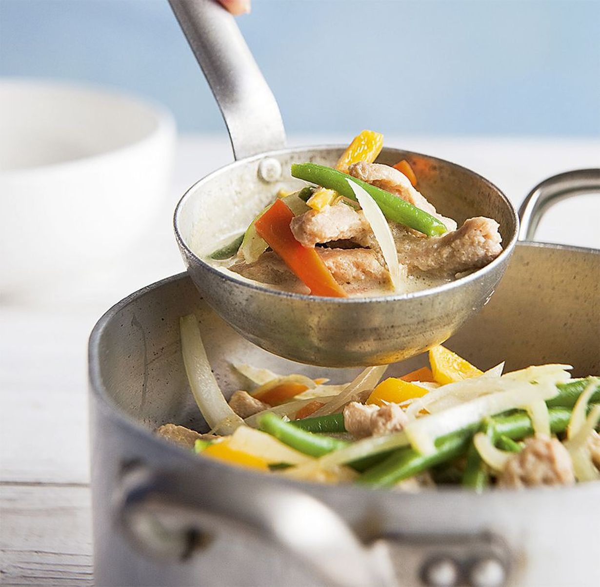 - Kaada sekaan kookosmaito ja vesi. Mausta currytahnalla ja kalakastikkeella. Keitä miedolla lämmöllä noin 10 minuuttia. Lisää paprikat ja jäiset pavut. Jatka kypsentämistä vielä 5 minuuttia tai kunnes ainekset ovat kypsiä.
