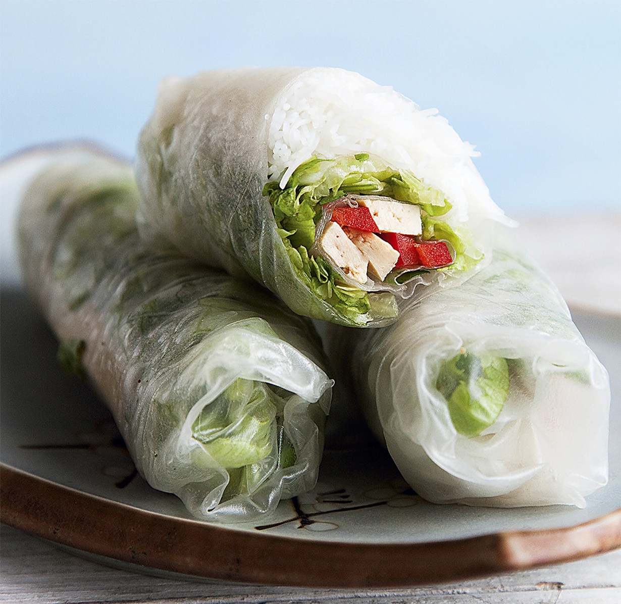 Ota yksi riisipaperilevy ja kasta se nopeasti kylmään veteen. Ravista kevyesti enimmät vedet pois ja aseta työlaudalle. Asettele arkin alareunaan vermiselliä, salaattia, paprikaa, yrttejä ja tofua. Nosta arkin reunat täytteelle ja kääri rullalle. Täytä loput arkit samalla tavalla.