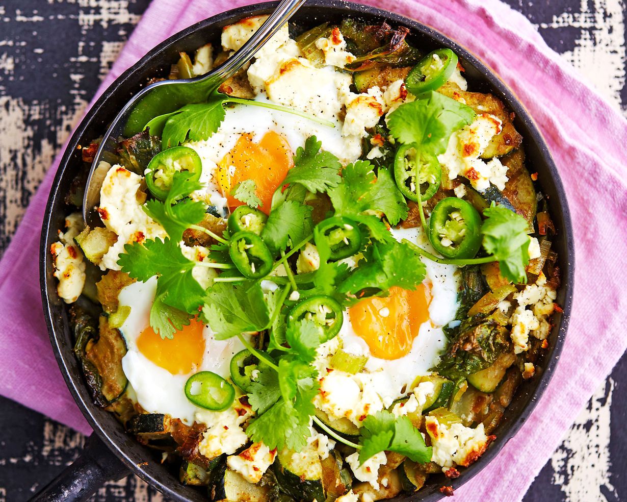 - Kypsennä pannua uunissa viitisen minuuttia, kunnes munat kypsyvät ja feta ruskistuu hieman. Viimeistele pannu korianterinlehdillä ja chilirenkailla.