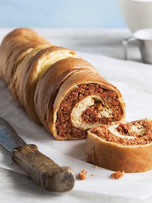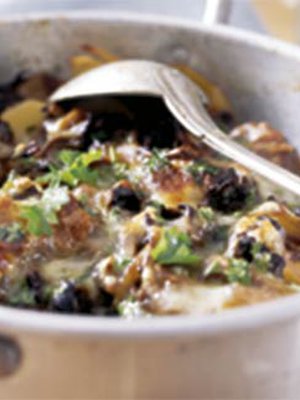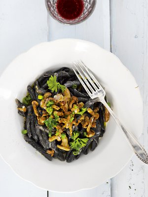 Balsamicolla marinoitu kantarelli-sipuli-vuohenjuustopiiras
