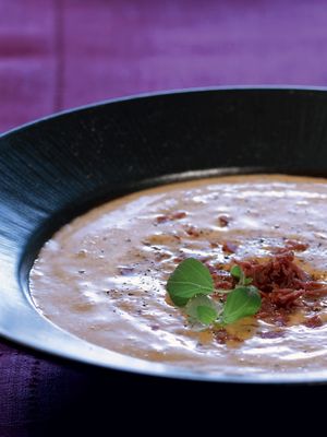 Palsternakka-valkopapusosekeitto ja karamellisoidut pekonipopparit