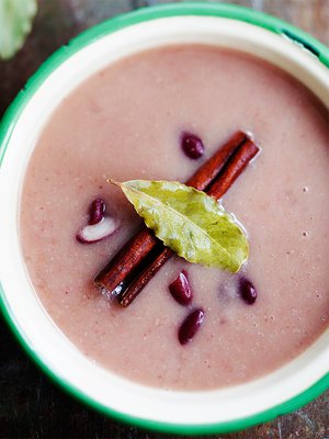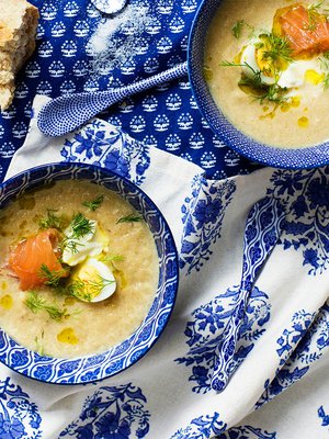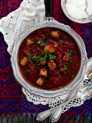 Borssikeitto, rapeaa pekonia ja yrttismetanaa