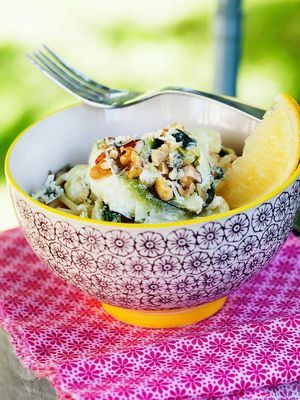Tomaattinen makkara-omenakastike ja täysjyväpastaa