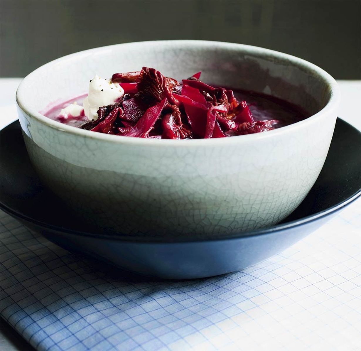 Raasta tai suikaloi kuoritut punajuuret ja porkkana. Hienonna kuorittu sipuli ja valkosipulit. Paista pilkottuja tuoreita suppilovahveroita kattilanpohjalla öljyssä, kunnes neste on haihtunut. Lisää sekaan kasvisraasteet ja kuullota ne.