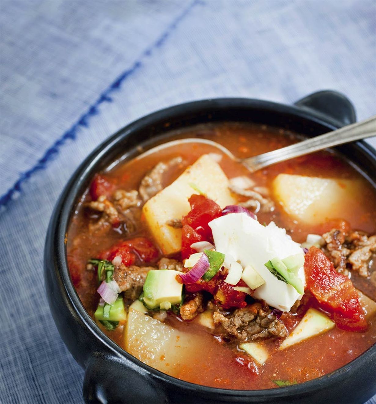 Lisää sekaan tomaattimurska ja tacokastike. Keitä edelleen, kunnes perunat ovat kypsiä. Kuori ja pilko avokado ja sipuli. Tarjoa keitto niiden ja ranskankerman kanssa.