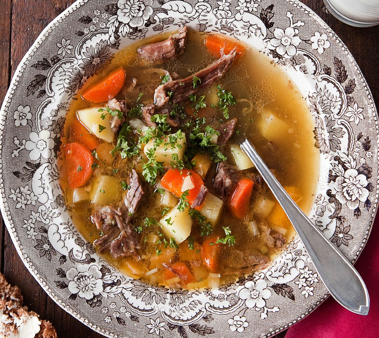 - Kaada lihaliemi kattilaan ja lisää kiehumaan porkkanat, selleri, lanttu ja palsternakka. Keitä puolikypsiksi ja lisää kuoritut ja paloitellut sipulit, perunat ja purjo. Keitä, kunnes perunat ovat kypsiä. Lisää lopuksi lihapalat. Kiehauta, tarkista maku ja lisää halutessasi suolaa. Ripottele keiton päälle hienonnettua persiljaa tai ruohosipulia.