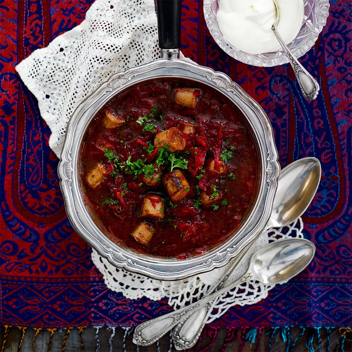 Lisää kattilaan lopuksi lihapalat ja etikka sekä halutessasi paloitellut makkarat. Silppua keiton päälle tuoretta persiljaa. Tarjoa smetanan ja ruisleivän kanssa.