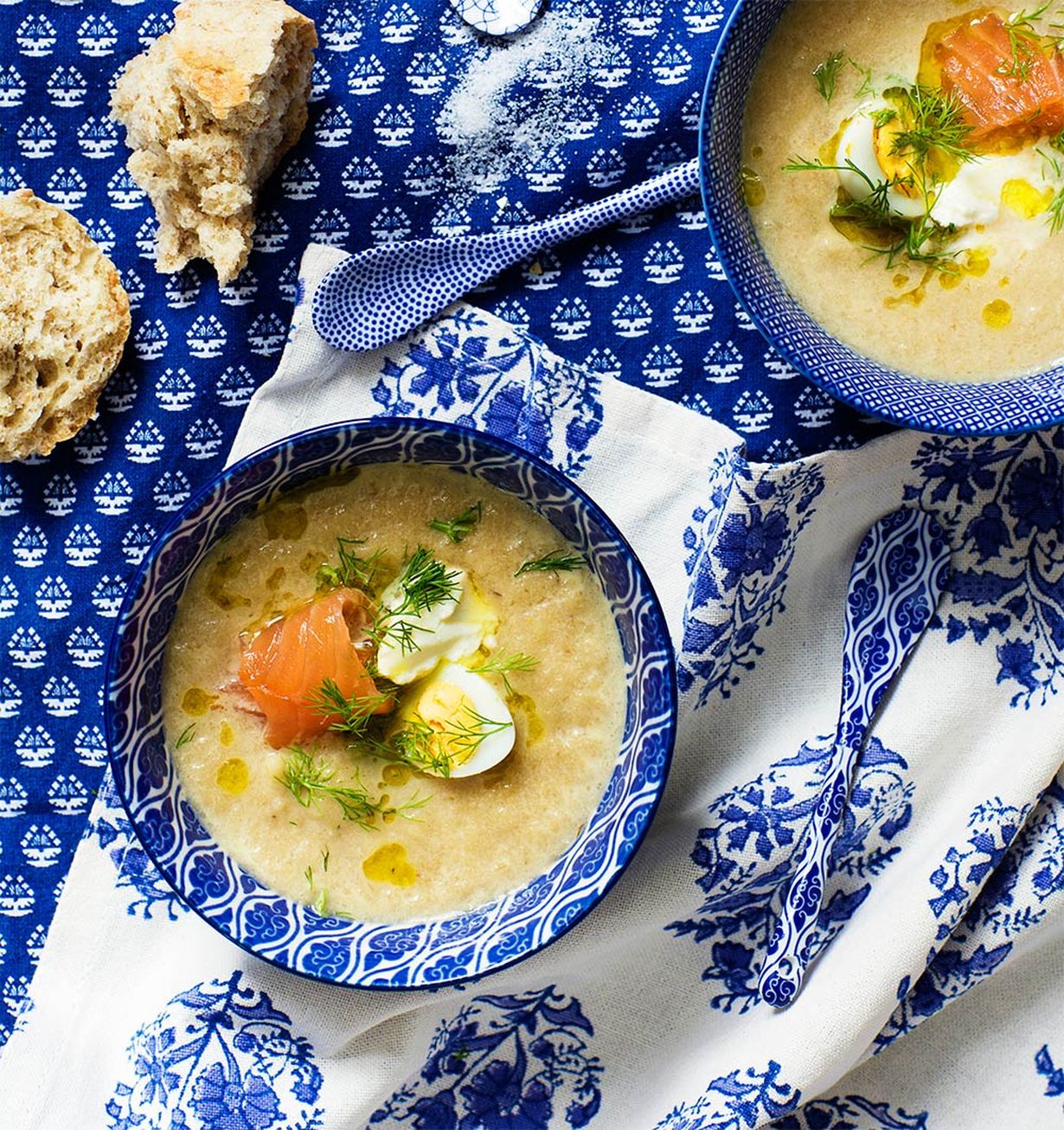 Pehmeän täyteläisen fenkolikeiton makua täydentävät viiriäisenmunat, smetana, kylmäsavulohi ja pinnalle valutettu tilkka oliiviöljyä.