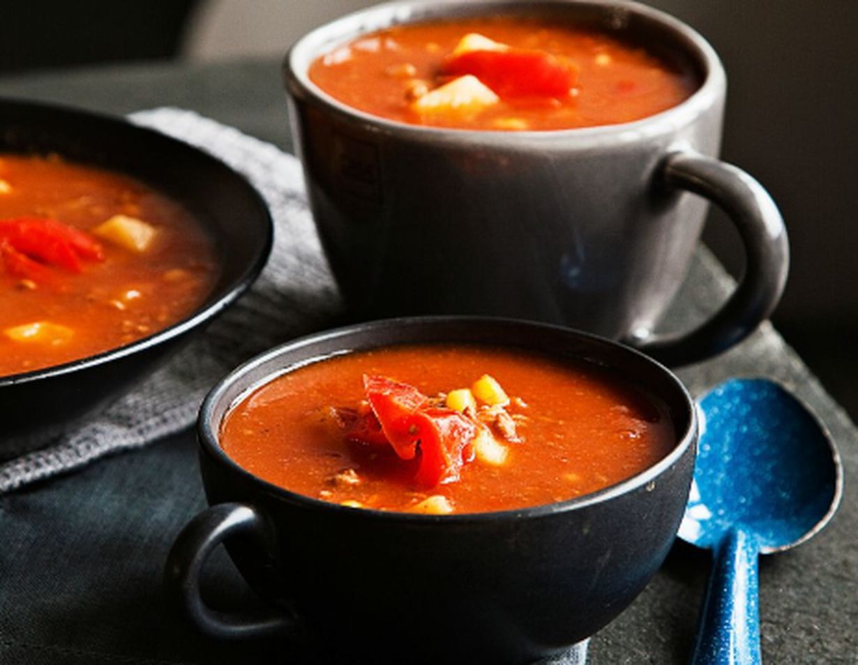 Tomaattisen keiton maku vain paranee, jos annat sen hautua kunnolla. Tomaattimurskan voit korvata pehmenneillä tomaateilla.