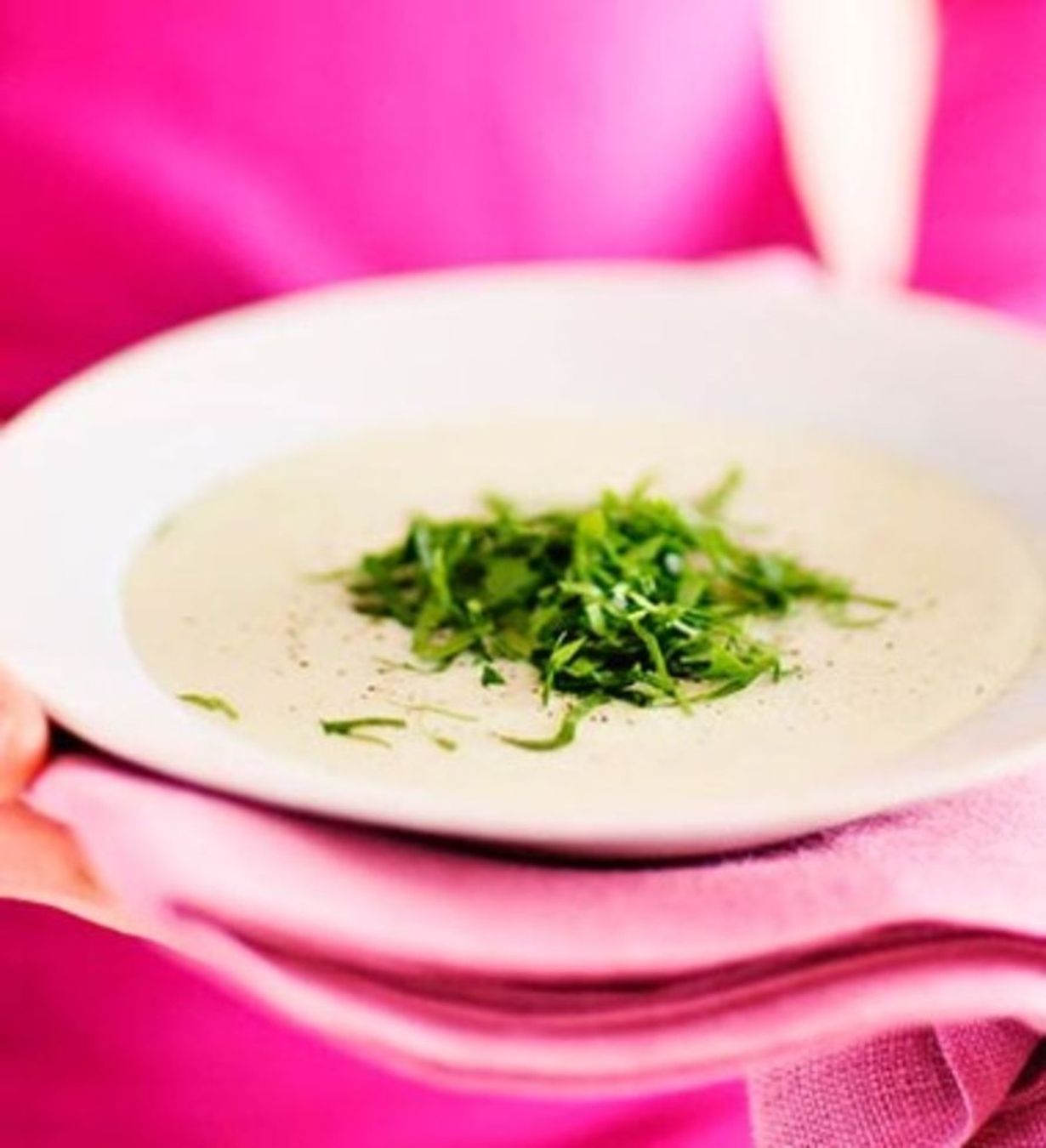 - Kaada kasvikset liemineen tehosekoittimeen ja soseuta sileäksi keitoksi. Voit soseuttaa keiton myös teräskattilassa sauvasekoittimella. Kaada keitto takaisin kattilaan. Lisää kerma ja hienonnetut yrtit. Kuumenna ja tarjoa.