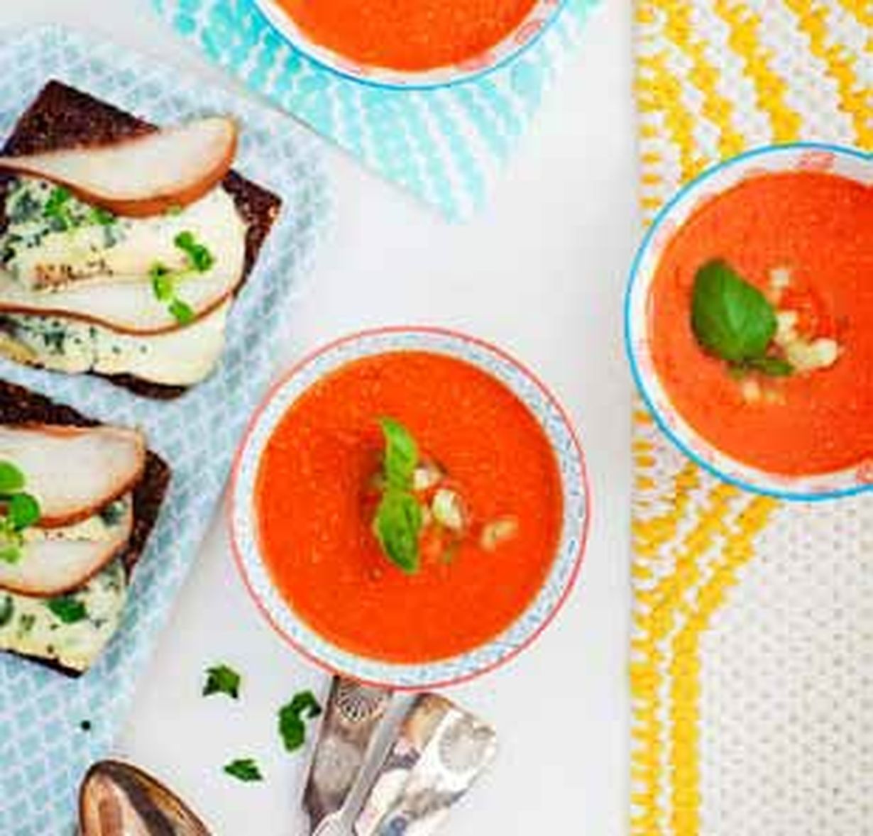 Kylmän tomaattikeiton kanssa maistuvat lämpimät leivät.