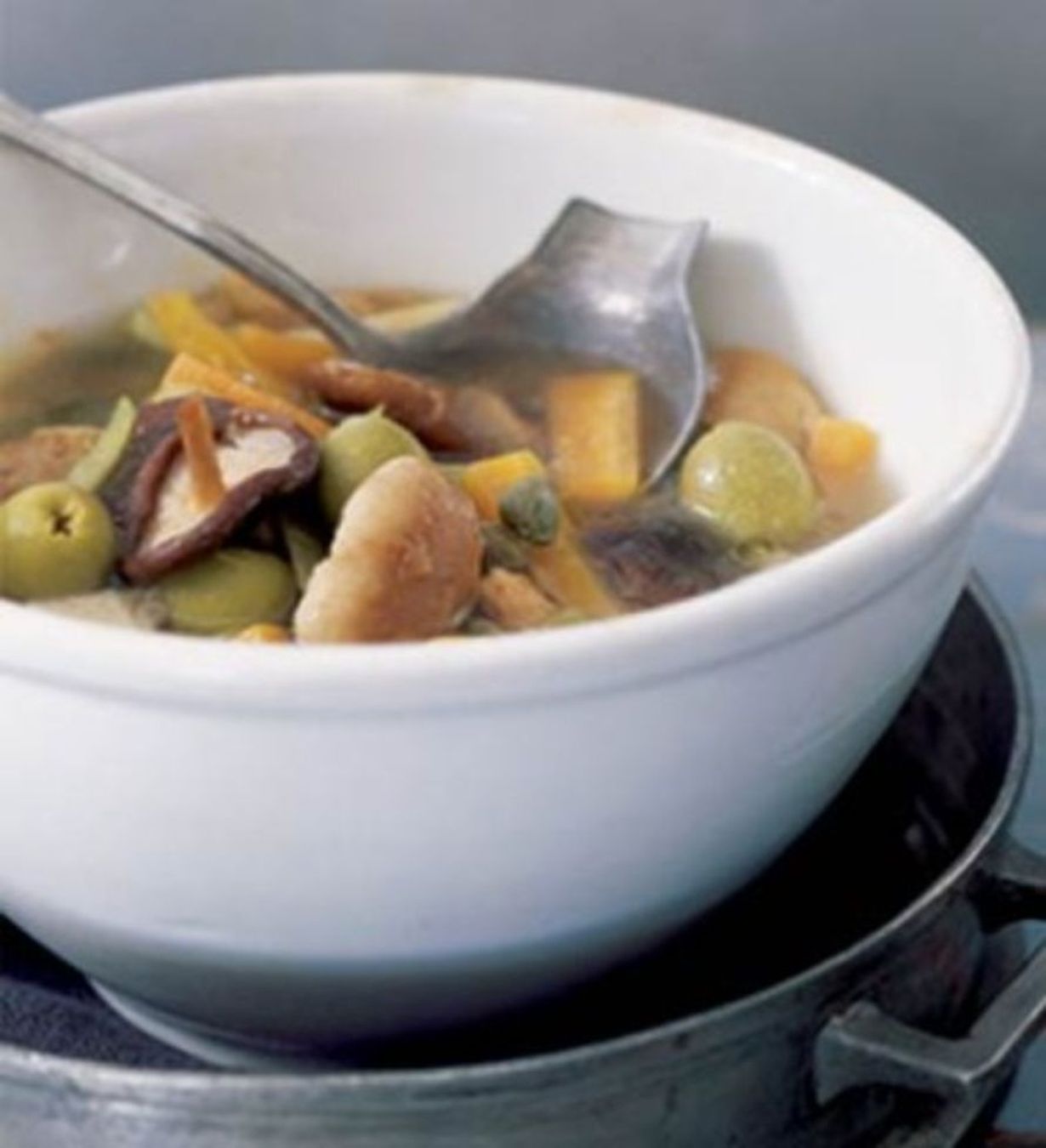 2. Leikkaa kasvikset suikaleiksi ja kiehauta voissa yhdessä siitakesienien kanssa. Lisää vesi, suolakurkun liemi, siirappi, liemikuutio, murskattu valkosipuli, laakerinlehti, persiljasilppu ja timjami.