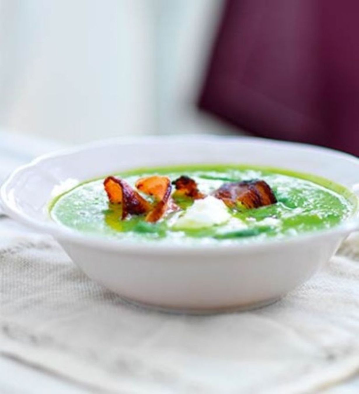 - Nostele hernekeitto keittokulhoihin. Nosta päälle rapeaa pekonia. Halutessasi lisää keiton pinnalle vielä nokare vuohenjuustotuorejuustoa.