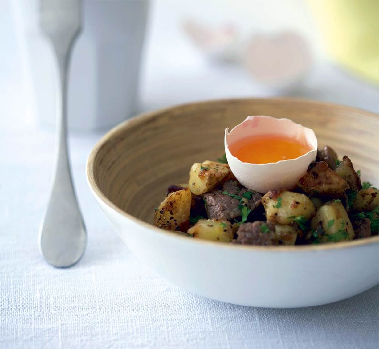 Ruskista lihapalat voissa. Mausta suolalla ja pippurilla. Sekoita sipulit, perunat ja liha yhteen persiljasilpun kanssa. Tarkista maku.