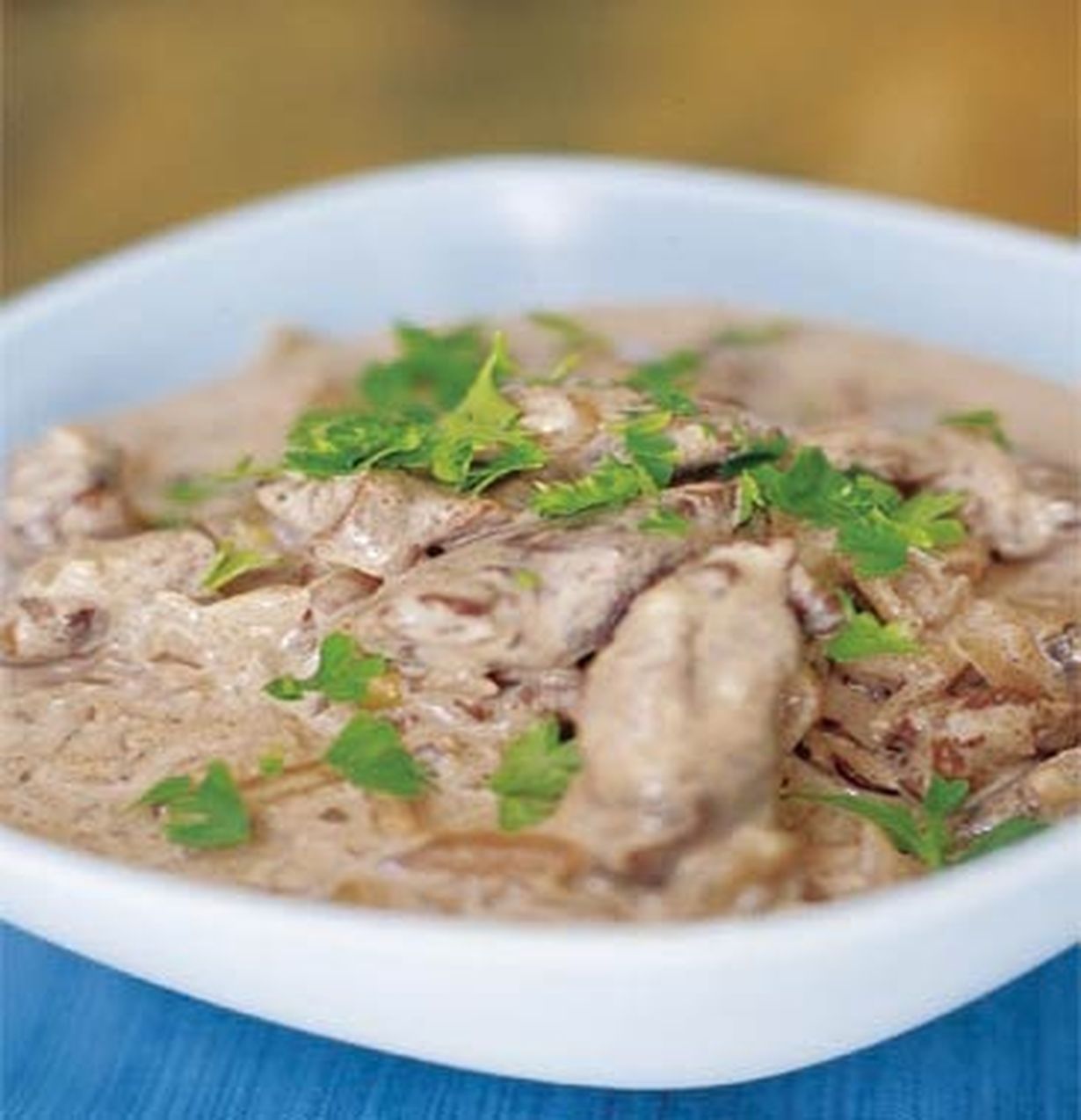 Hienonna sipuli ja kuullota kantarellien kanssa pannulla. Lisää paistetut lihat, kerma, smetana, maustepippuri ja suola. Kuumenna kastike.
