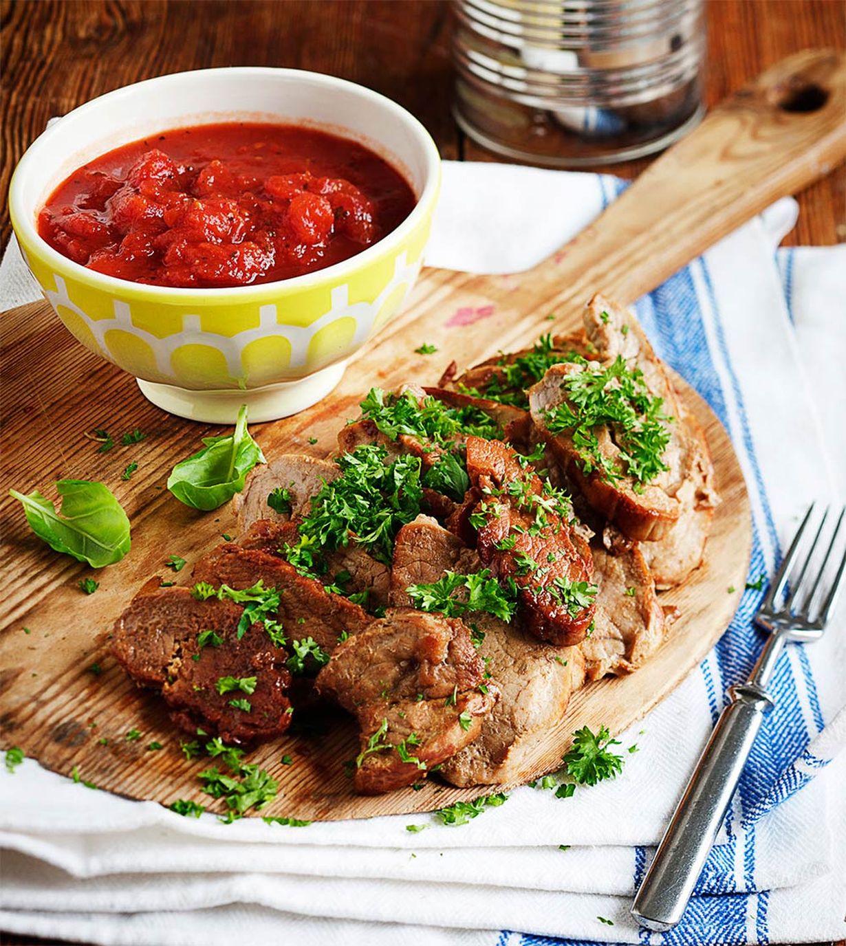 Kaada tomaattimurskat kattilaan. Mausta 3 rkl hunajalla, 2 rkl soijalla ja pippurilla. Kaada kastike pannulle possuviipaleiden päälle. Anna hautua ja maustua kannen alla 10–15 minuuttia. Tarjoa sellaisenaan salaatin, pastan, riisin tai perunoiden kanssa.