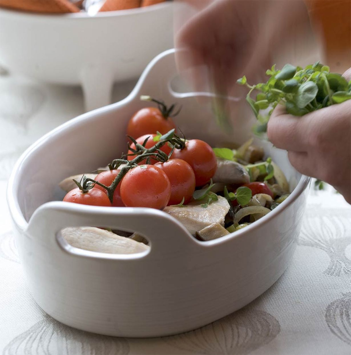 Nosta broileripalat kasvisten sekaan ja kaada päälle vesi. Kumoa sekaan tomaatit.