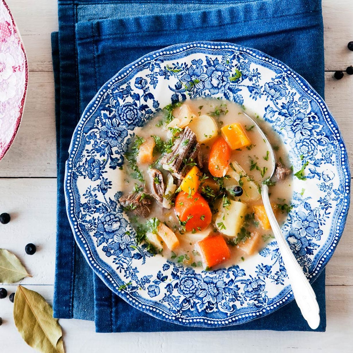 - Laita liha kattilaan. Kaada päälle vettä sen verran, että liha peittyy. Lisää kattilaan laakerinlehdet, katajanmarjat sekä kuoritut ja paloitellut sipulit, porkkanat ja palsternakka. Keitä lihaa noin kaksi tuntia, kunnes se irtoaa luista lähes itsekseen.