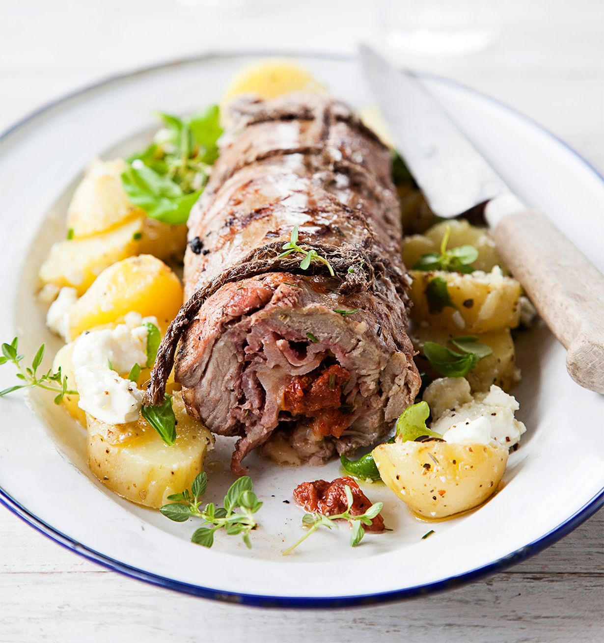 Tarjoile grillattu porsaanfileerulla feta-perunasalaatin ja kasvisten kanssa.