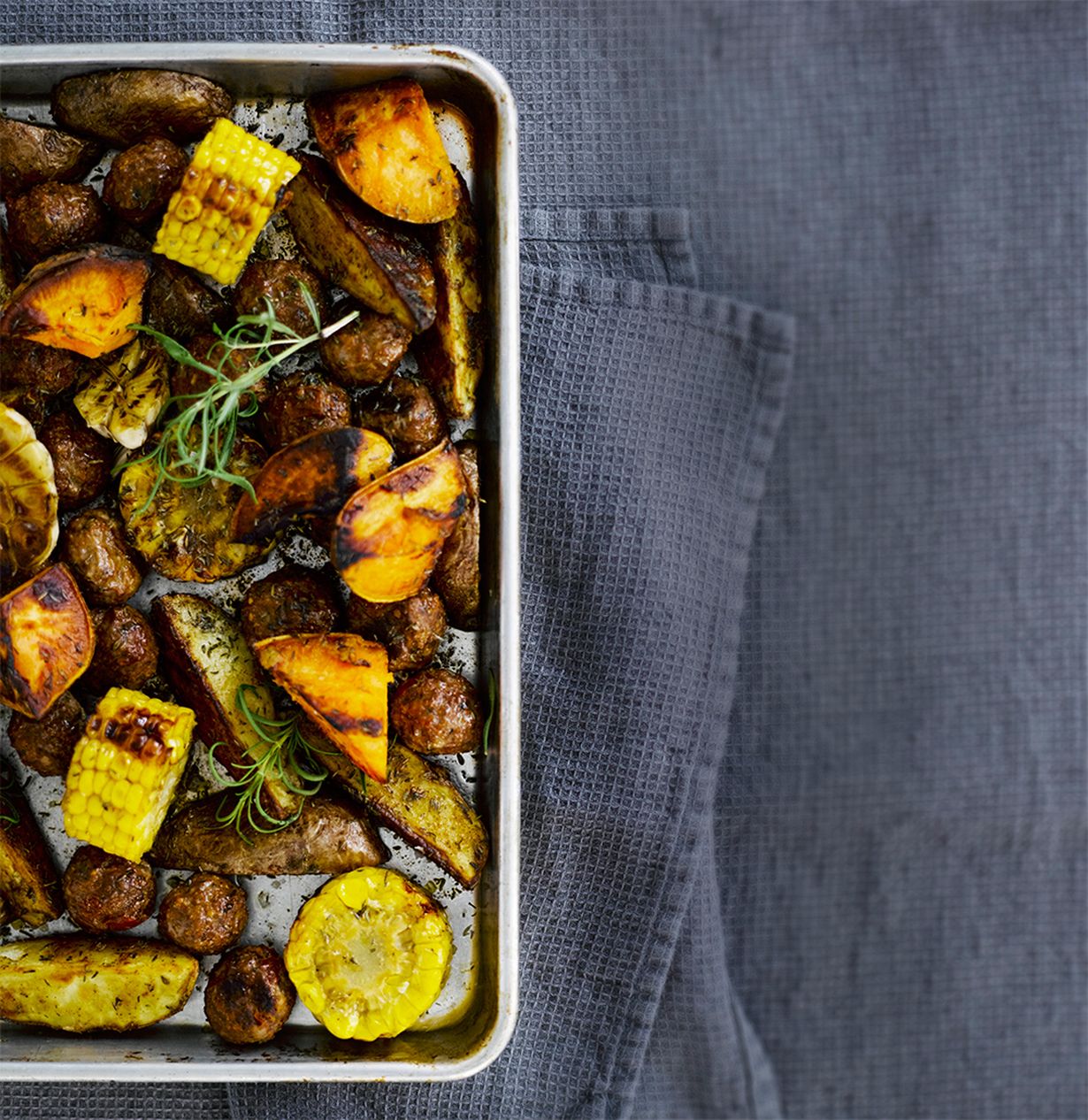 - Puhdista perunat ja bataatti ja leikkaa lohkoiksi. Paloittele maissi. Sekoita mausteseoksen aineet yhteen. Kääntele kasvikset mausteseoksessa ja nosta reunalliselle uunipellille leivinpaperin päälle. Laita halutessasi päälle tuoreita rosmariininoksia. Paista 200 asteessa uunin keskitasolla 20–25 minuuttia.