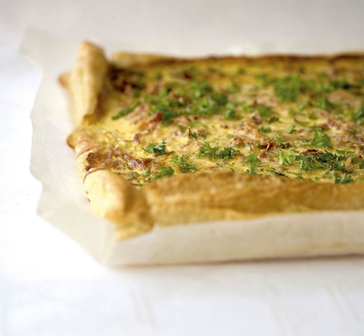 Sekoita kermaviili, ranskankerma, tuorejuusto ja munat notkeaksi seokseksi. Mausta ja lisää joukkoon pekonipalat, kinkkusuikaleet, persiljasilppu sekä juustoraaste. Levitä täyte pohjan päälle ja tasoita pinta.