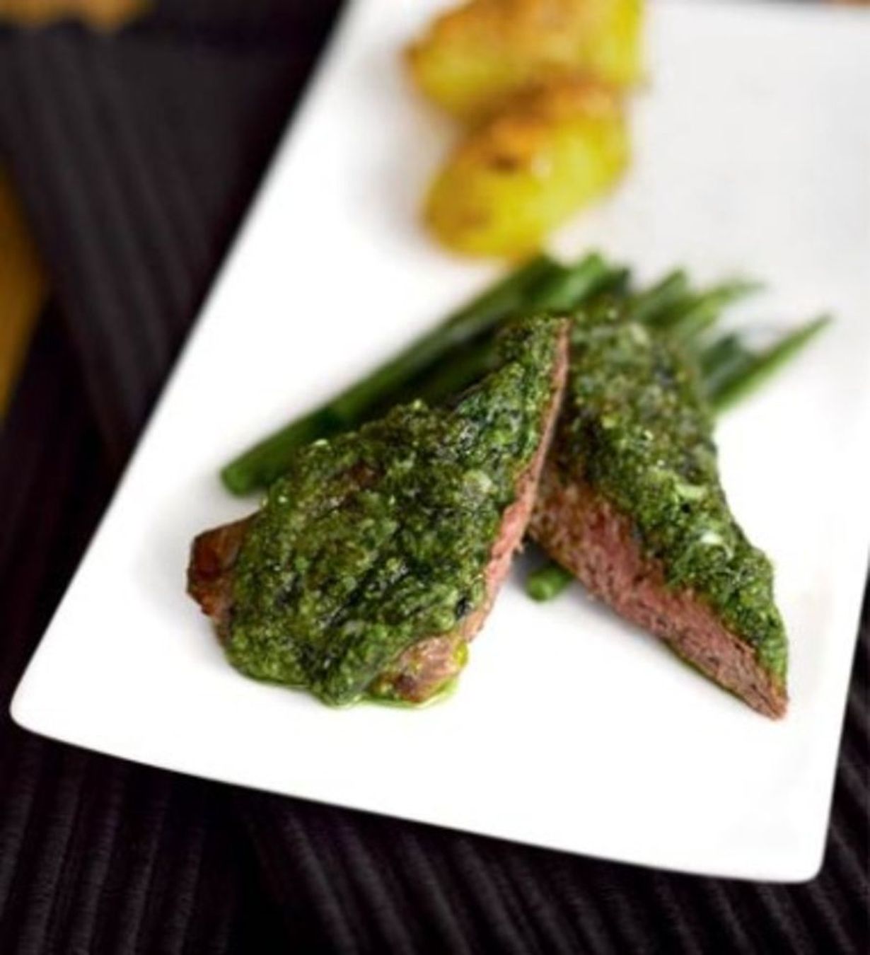 - Nosta fileet uunivuokaan. Levitä basilikatahna lihan pintaan. Laita paksuimpaan fileeseen lihalämpömittari. Kypsennä fileitä uunissa, kunnes lihan sisälämpötila on 55 astetta. Ilman mittariakin onnistut: 8-10 minuutin paistamisen jälkeen liha on kauniin roseenpunaista sisältä. Ota vuoka uunista ja peitä foliolla. Anna vetäytyä 5-10 minuuttia.