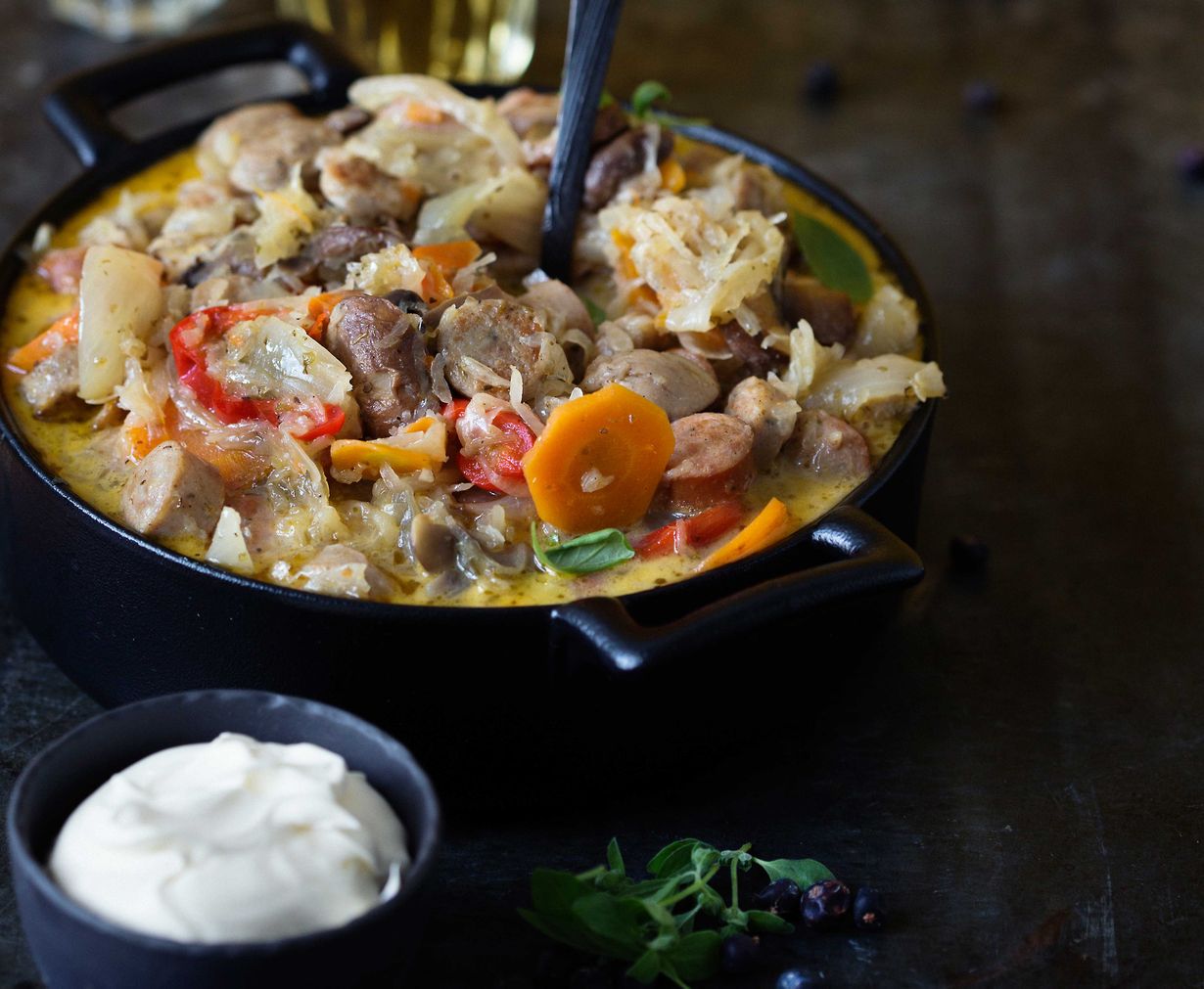 Nokare smetanaa ja lasillinen olutta aateloivat hapankaali-makkarapadan.